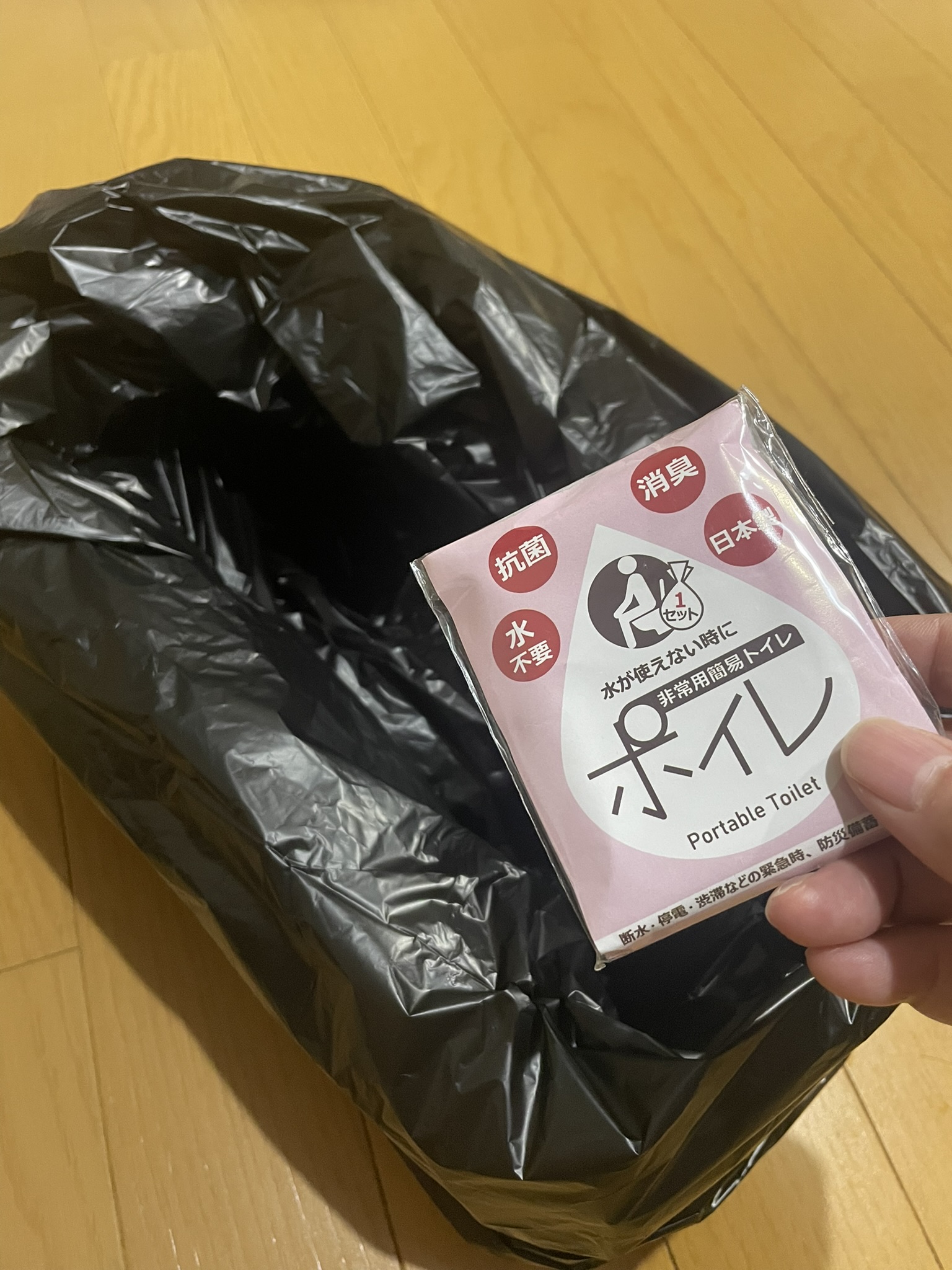 私が今使っているのは「ポイレ」という携帯トイレです。この中には黒いビニール袋と凝固剤が入っています。袋は1枚だけなので、別途30Lのゴミ袋をプラスチックケースに広げて、さらにその上から「ポイレ」の袋をかぶせてその中に凝固剤を入れる…ということをしています。これで袋が2重になるので少しは安心かな。
